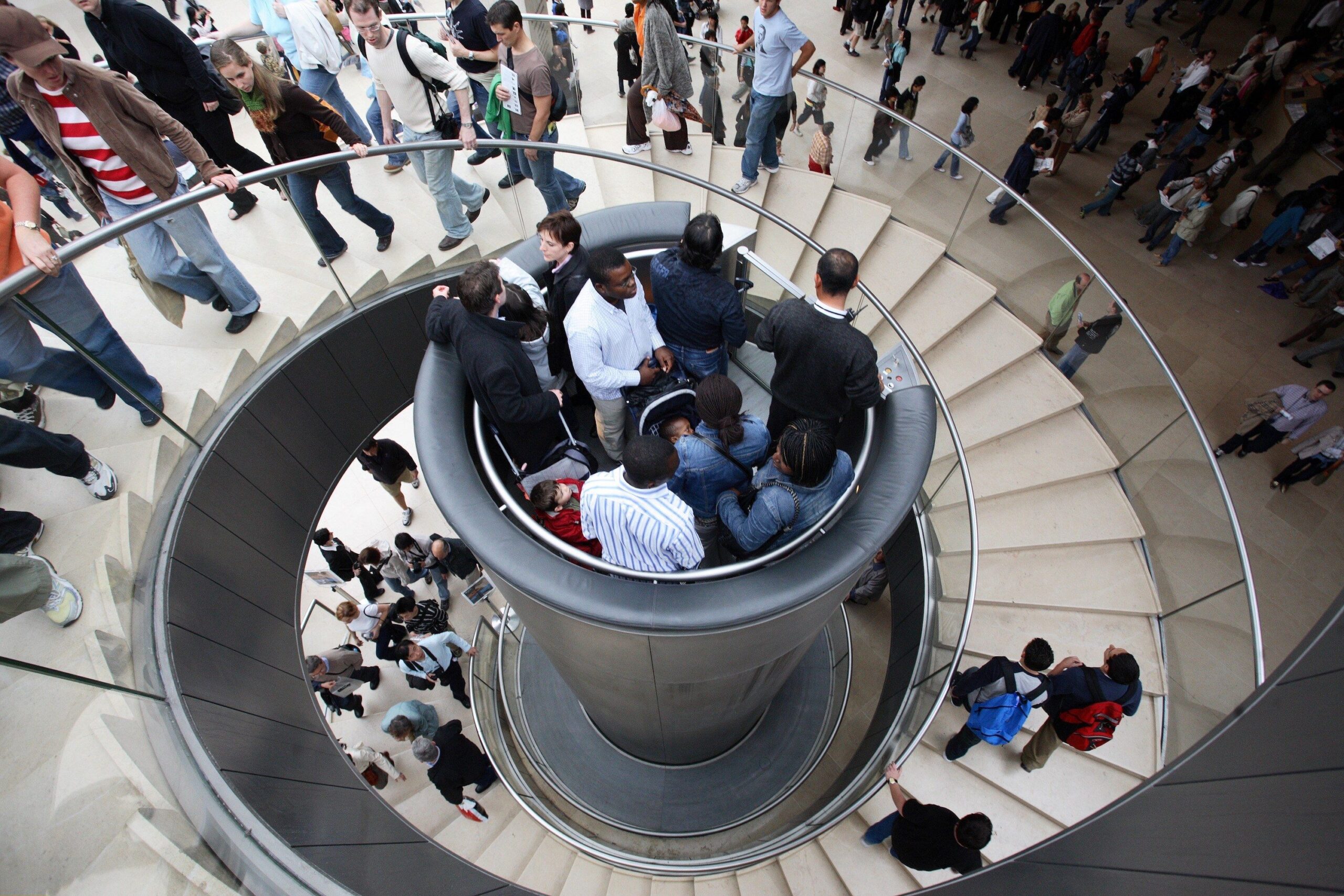 Bên trong bảo tàng Louvre được lắp đặt 1 chiếc thang máy công nghệ truyền độc thủy lực. Thang máy đẹp với thiết kế độc đáo như trong những bộ phim viễn tưởng, chiếc thang máy này là công cụ vận tải giúp hành khách tham quan bảo tàng một cách nhẹ nhàng.