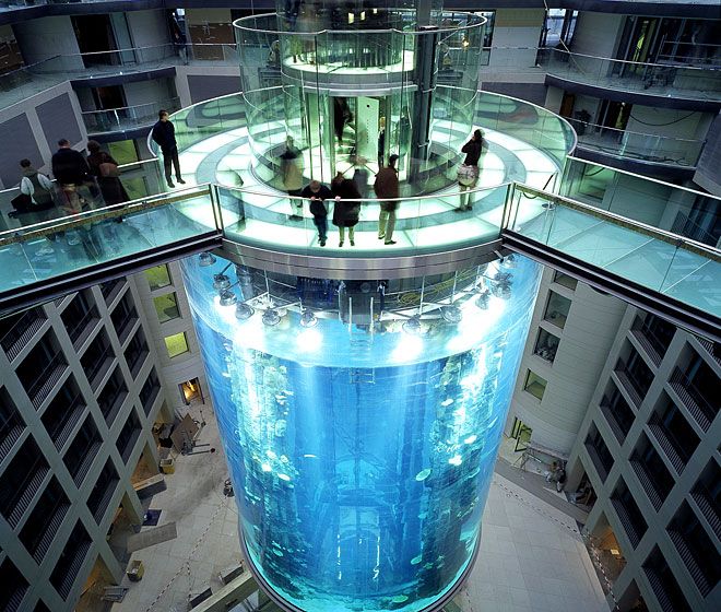 Thang máy AquaDom được thiết kế bên trong khách sạn Radisson Blu ở Berlin, Đức. Được xây dựng theo một khối hình trụ trong suốt đặt giữa một thủy cung và cao 25m. Chi phí xây dựng khoảng 12,8 triệu Euro. Đây là điểm thu hút của rất nhiều khách tham quan. Điểm đặc biệt chính là thủy cung bao quanh thang máy, với dung tích lên đến 1 triệu lít nước với hơn 1500 cá thể thuộc hơn 50 loài cá khác nhau. Mỗi ngày đàn cá tiêu thụ 8kg thức ăn và cần 3 đến 4 người vệ sinh và chăm sóc.