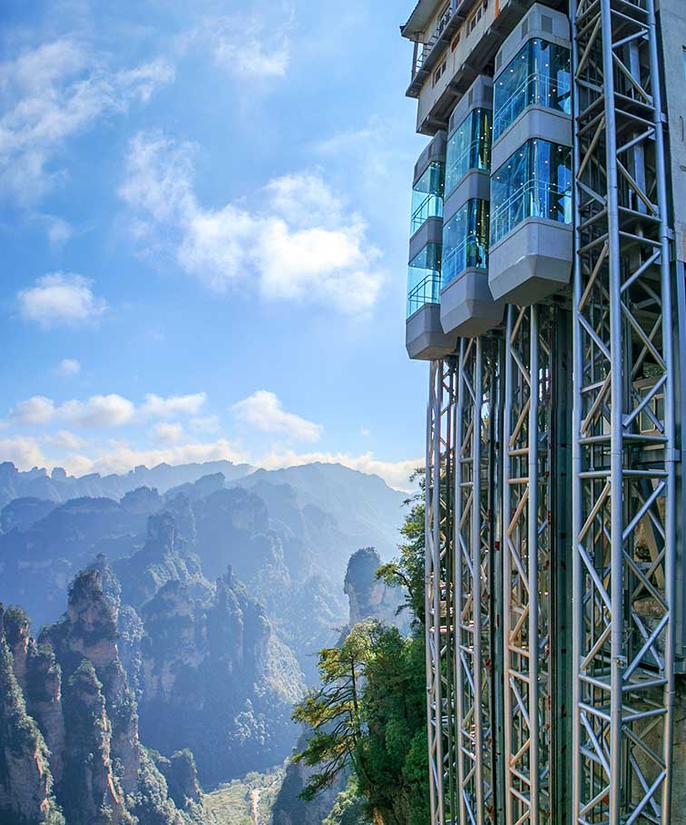 Đây là chiếc thang máy ngoài trời cao nhất thế giới được lắp đặt trên vách đá lớn ở Trương Gia Giới, Trung Quốc. Thang máy Bách Long không chỉ là một địa điểm du lịch nổi tiếng mà nó còn nắm giữ ba kỷ lục thế giới bao gồm: Chiếc thang máy ngoài trời cao nhất thế giới, thang máy ngắm cảnh hai tầng cao nhất và thang máy chở khách có sức chứa lớn nhất. Thang máy có sức chứa 50 người, các vách cabin được làm từ kính cường lực trong suốt, giúp du khách có thể nhìn ngắm toàn cảnh các dãy núi hùng vĩ trong khu vực.