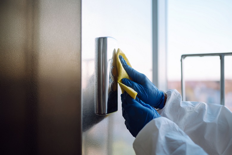 Dùng chất tẩy rửa làm ướt khăn, sau đó thực hiện vệ sinh bề mặt vách kính, bảng điều khiển, cửa tầng, cửa cabin và trần giả…Thực hiện lau các tấm kính nhẹ nhàng, tránh làm xước kính hoặc phai màu của các chi tiết khác như nút bấm hoặc tay vịn.